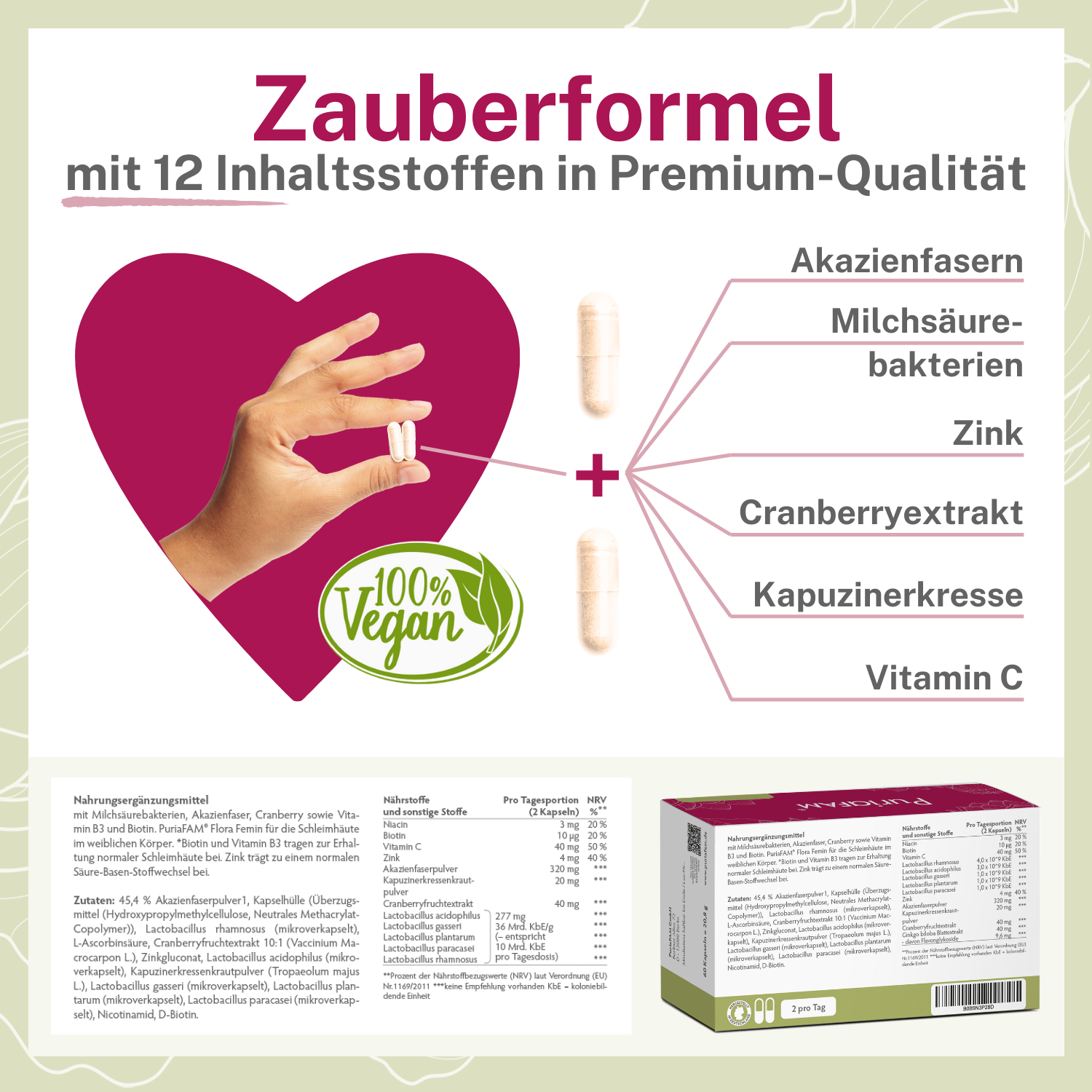 - Das Besondere an PuriaFAM® Flora Femin: Unsere Formel wird durch hochwertige Pflanzenstoffe ergänzt. Akazienfasern, die auch bei Fructose-Unverträglichkeit geeignet sind, liefern wertvolle Ballaststoffe zur Ernährung der guten Bakterien. Cranberry-Extrakt und Kapuzinerkresse runden die Kombination perfekt ab.